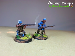 Kolejni Francuzi nadchodzą! Skończyłem następnych dwóch żołnierzy z Compagnie Franches de la Marine, przeznaczonych do Muszkietów i Tomahawków. Muszę przyznać, iż modele Warlorda są dosyć udane. Posiadają ciekawe detale, nadające im ten nie do końca regularny charakter, a zbliżając ich do traperów i harcowników.
